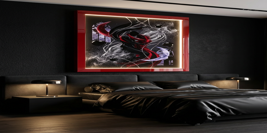 Dieses eindrucksvolle Kunstwerk zeigt eine verschlungene, mystisch-düstere Umarmung, eingerahmt von zerbrochenen Fenstern, schwebenden Partikeln und einem magischen Mondlichtspiel. Die kraftvolle Farbpalette aus Schwarz, Blutrot und Violett erzeugt eine tief emotionale Wirkung und macht das Bild zum perfekten Statement-Piece für moderne, atmosphärische Wohnräume.